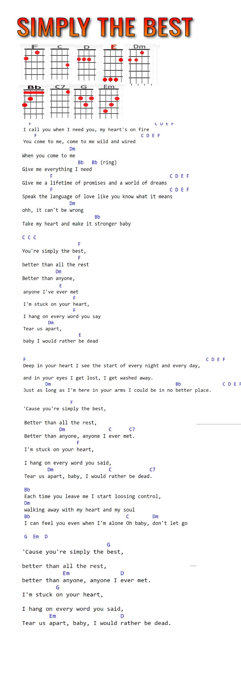 F, C, D, E, Bm, Bb, C7, G, Em
