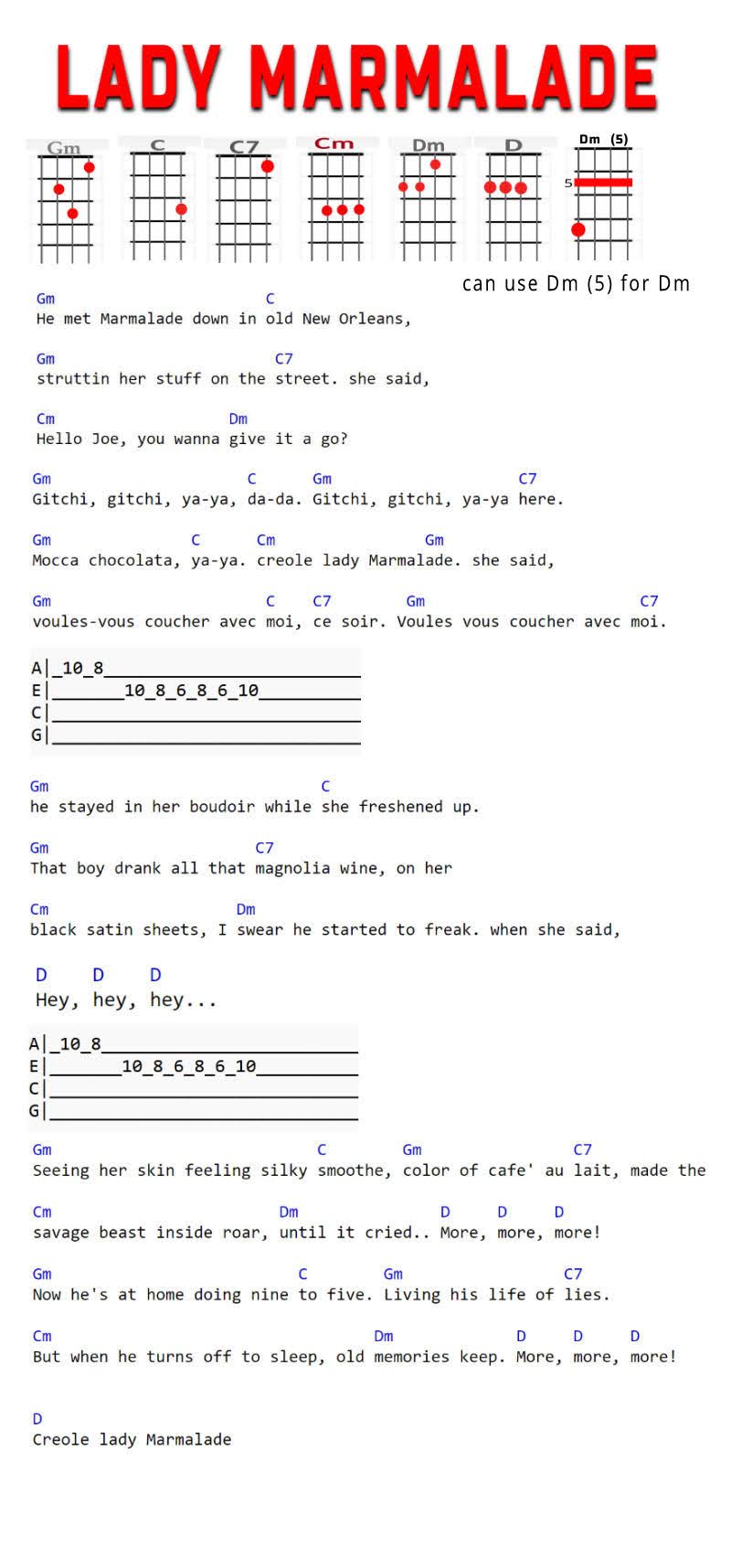 Gm, C, C7, Cm, Dm, D